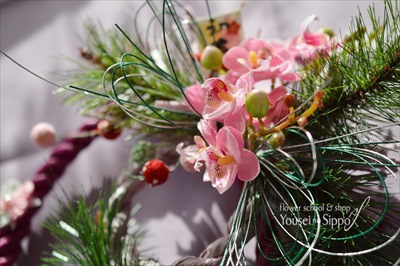 ピンクの濃淡のしめ縄2種を使って仕上げた可愛らしいしめ飾りです。