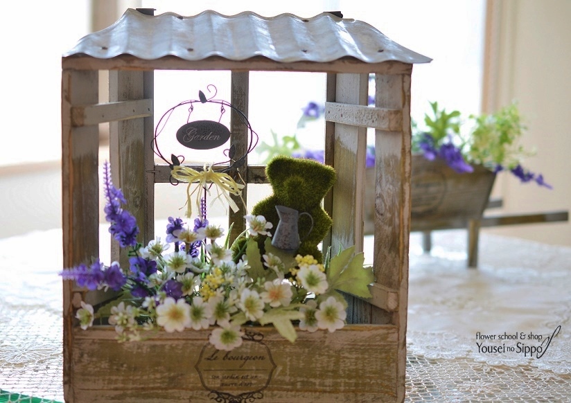 ナチュラルカントリーの木製の小屋の中にくまさん( ̄(エ) ̄)v